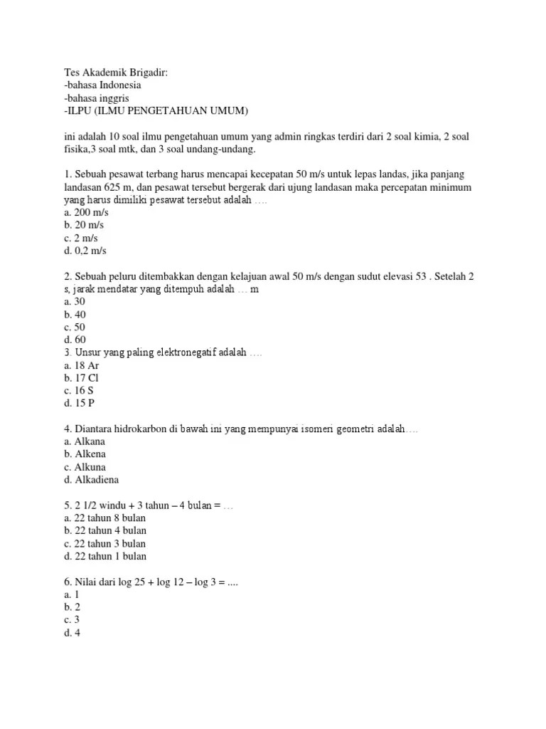 Contoh soal akademik pengetahuan umum brigadir yang bisa kalian pelajari sebagai persiapan untuk mengikuti tes akademik di seleksi penerimaan polri. Adapun contoh soal materi uji tes akademik pengetahuan umum akpol . Sialakan latih kemampuan anda untuk materi deret hitung/deret ukur. Tes akademik polri 2018 atau uji akademik tahun ini dilakukan serentak antara 18. Tes akademik polri atau sering disebut tes potensi akademik (tpa).
